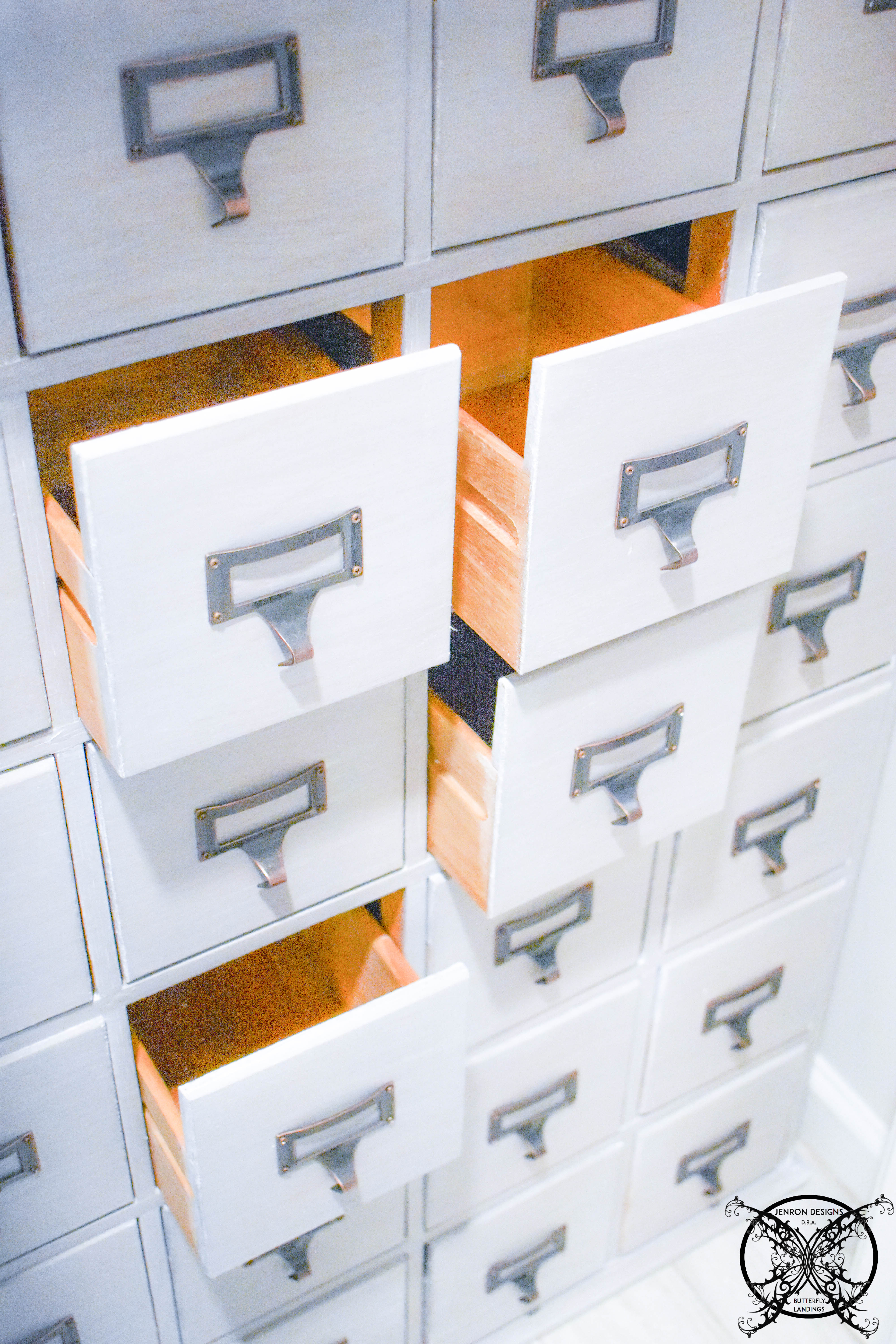 So for this project we removed all the hardware and only painted the fronts of the drawers and the outer shell of the cabinet. I actually like the way it exposes the oak color drawers inside when you open them. To me it makes it feel more like a found antique versus a new item that I purchased, considering all the card catalogues I remember in school  were always oak.