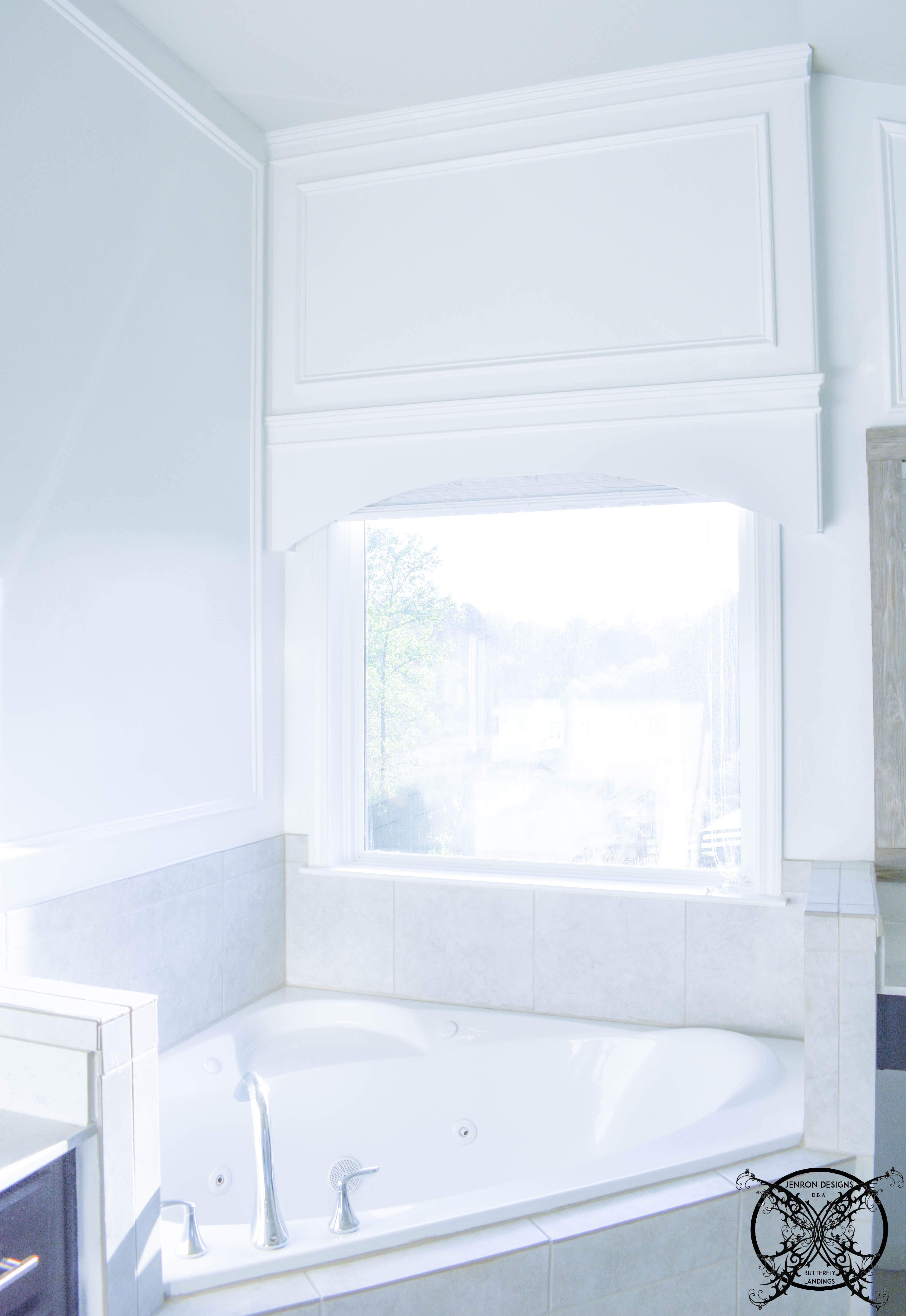 Okay, so some great painting tips are to pre paint anything that will be hard to get too later on. For example, the inside of the custom cornice we installed last week; was pre painted prior to ever building out the front. Along with the wall behind it.  This wall can be seen from inside the tub, and needed to be painted. However it would have been a lot more challenging this week after the cornice was installed.
